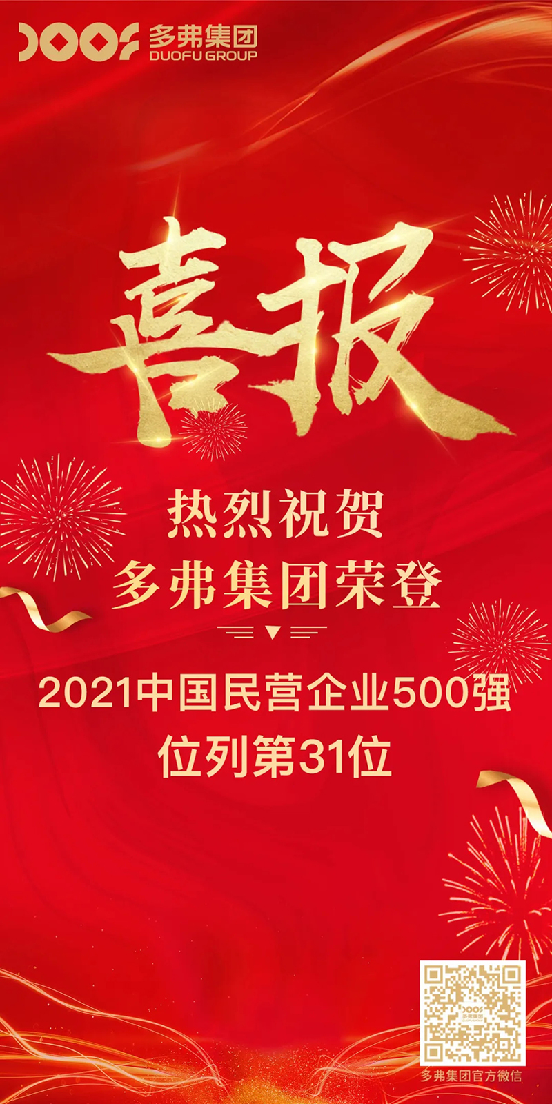 同日,全國(guó)工商聯(lián)在長(zhǎng)沙發(fā)布《2021中國(guó)民營(yíng)企業(yè)500強(qiáng)榜單》,多弗國(guó)際控股集團(tuán)再次蟬聯(lián),以1909.1564億元營(yíng)收位居第31位。
