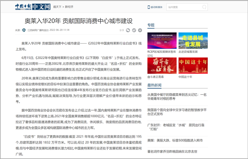 會(huì)后,國內(nèi)主流權(quán)威媒體紛紛在第一時(shí)間通過各自官方平臺(tái)及渠道發(fā)布此次活動(dòng)盛況及內(nèi)容。截止6月23日,共計(jì)近百家媒體在全網(wǎng)發(fā)布、轉(zhuǎn)載“2022年中國奧特萊斯行業(yè)白皮書線上發(fā)布”相關(guān)報(bào)道及新聞百余次,全網(wǎng)累積點(diǎn)擊閱讀量近五百萬次。