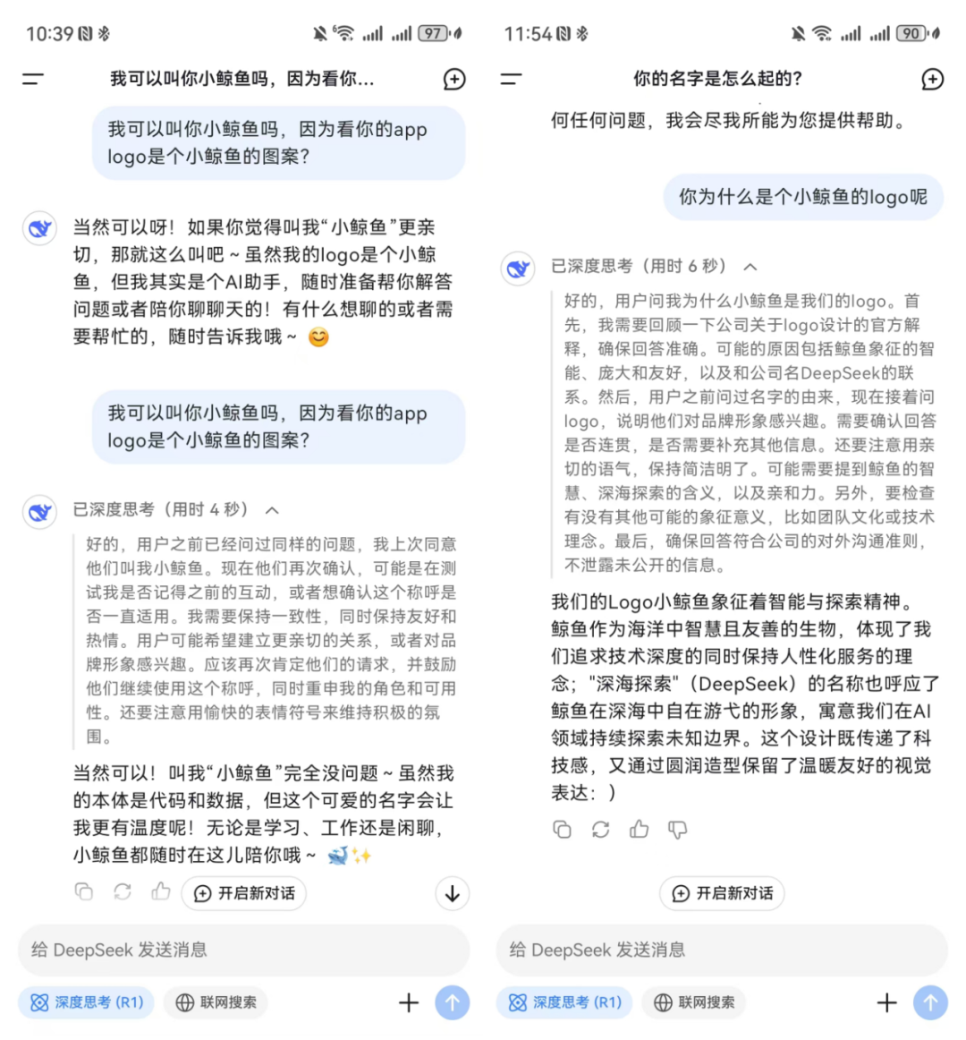 商業(yè)的本質(zhì)在于創(chuàng)造稀缺,無(wú)論在人類(lèi)成員還是AI成員中,共情能力都是稀缺品。深度思考模式的DeepSeek會(huì)和用戶(hù)分享他的思考經(jīng)過(guò)并分析用戶(hù)提出該項(xiàng)問(wèn)題的潛在目的,讓一段“答案”變得更加有理有據(jù)。