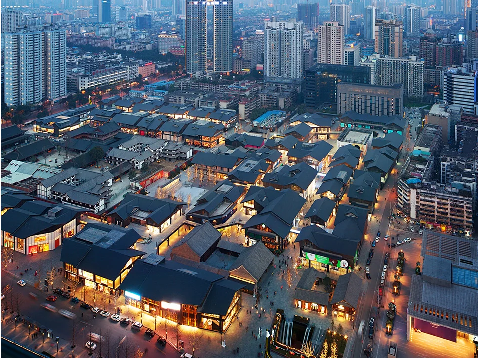 正如隈研吾所言:“在地性不是對(duì)傳統(tǒng)的復(fù)制,而是讓建筑成為土地呼吸的器官”。成都遠(yuǎn)洋太古里不僅完整保留了大慈寺片區(qū)6條歷史街巷(如筆帖式街、惜字塔巷等),還修復(fù)了廣東會(huì)館、欣廬等6座川西古建筑,通過(guò)“修舊如舊”手法重現(xiàn)“解玉溪”水系景觀,形成“一寺一城”的時(shí)空對(duì)話(huà)。建筑外立面采用川西青瓦坡屋頂與現(xiàn)代玻璃幕墻結(jié)合,檐口高度與街道寬度比例嚴(yán)格控制在1:1,營(yíng)造“街巷有度”的步行體驗(yàn)。